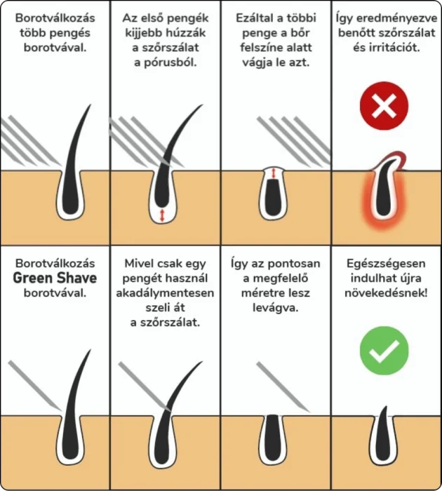 A Green Shave borotva 5-6 penge helyett, csak egy pengét használ. Kevesebb penge – kevesebb irritáció és benőtt szőrszál, ilyen egyszerű! Nem beszélve arról, hogy a sok pengés borotvák a szőrszálakat is roncsolják!