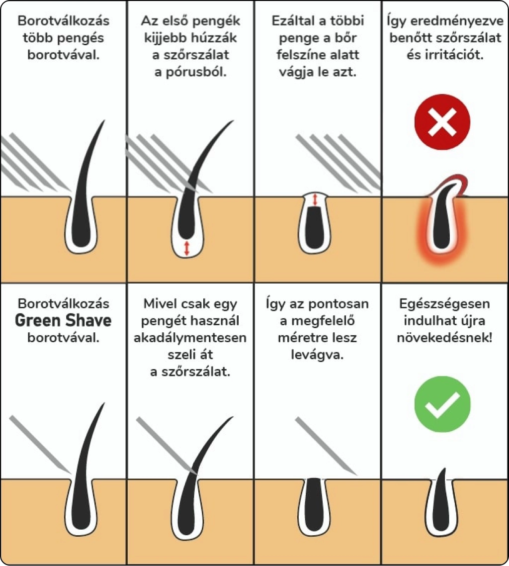 A Green Shave, a műanyag borotvákkal ellentétben csak egy pengét használ. Kevesebb penge = Kíméletesebb borotválás